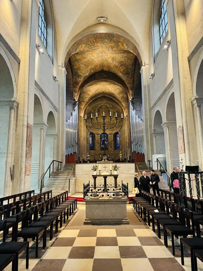 Ich war schon oft im Dom und mag sehr die Ruhe, die die hellen Steine ausstrahlen, das Licht, wenn Sonnenstrahlen durch die Fenster glitzern und auch die geschmackvolle Innenbeleuchtung. Diesmal sah ich zum ersten Mal die neue Chororgel. Ich wusste, dass sie zweigeteilt vorn stehen würde, links und rechts des berühmten Leuchters. Auf der Seite des Architekturbüros hatte ich gelesen, dass sie wie Engelsflügel den Leuchter einrahmen. Schon beim Lesen war ich berührt, wie achtsam und gut durchdacht da vorgegangen wurde. Mich hat sehr berührt, wie achtsam und kraftvoll das Neue zum Alten hinzu komponiert wurde. Als nach dem Konzert die Besucher hinaus flossen, nahm ich mir ein paar Momente, um im Mittelgang stehend, die Wirkung aufzunehmen.